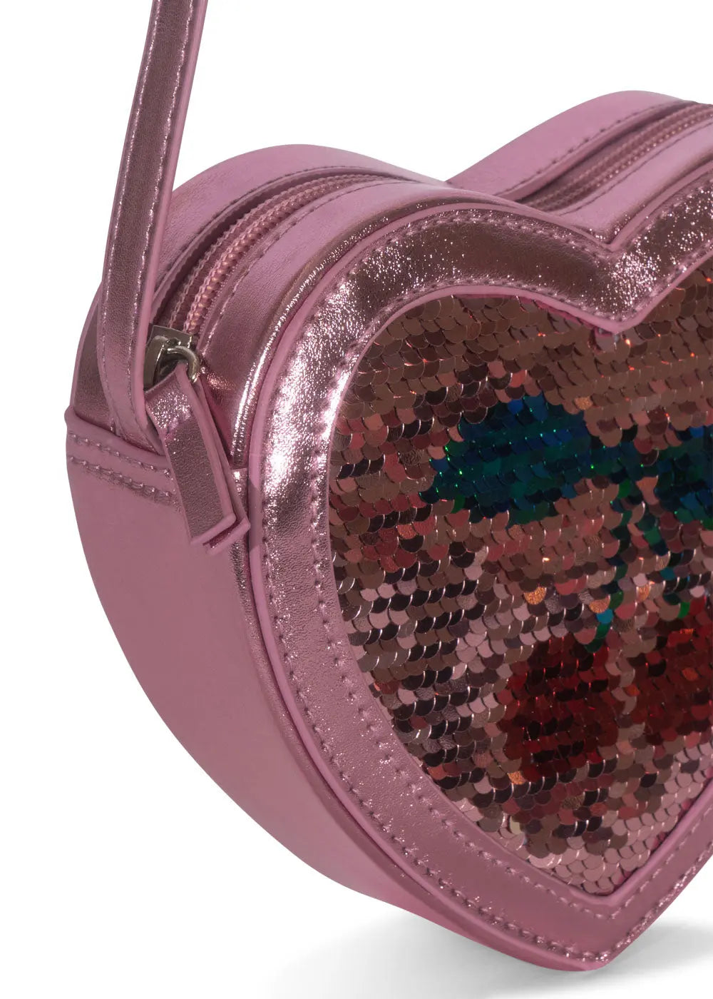 Heart-shaped shoulder bag with reversible sequin pattern. Materials: 70% polyurethane, 30% PET. Lining 100% polyester. Measurements: H: 13 cm x W: 15 cm x L: 4 cm. Suitable from 3y+.