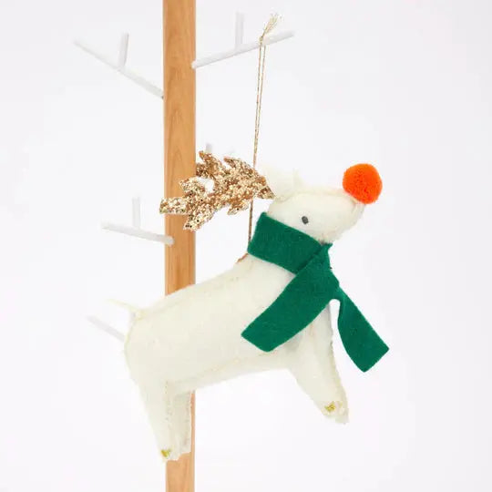 Este Lindo adorno de reno de fieltro voluntad Añade carácter y encanto a tu árbol de Navidad. Él Tiene una encantadora nariz de pompón, una bufanda verde y astas brillantes .