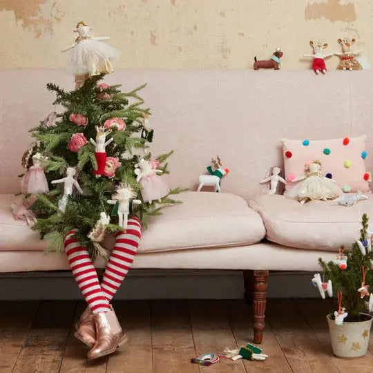 • Con una hermosa nariz de pompón rojo, una elegante bufanda verde y astas con detalles de tela con brillantina dorada.