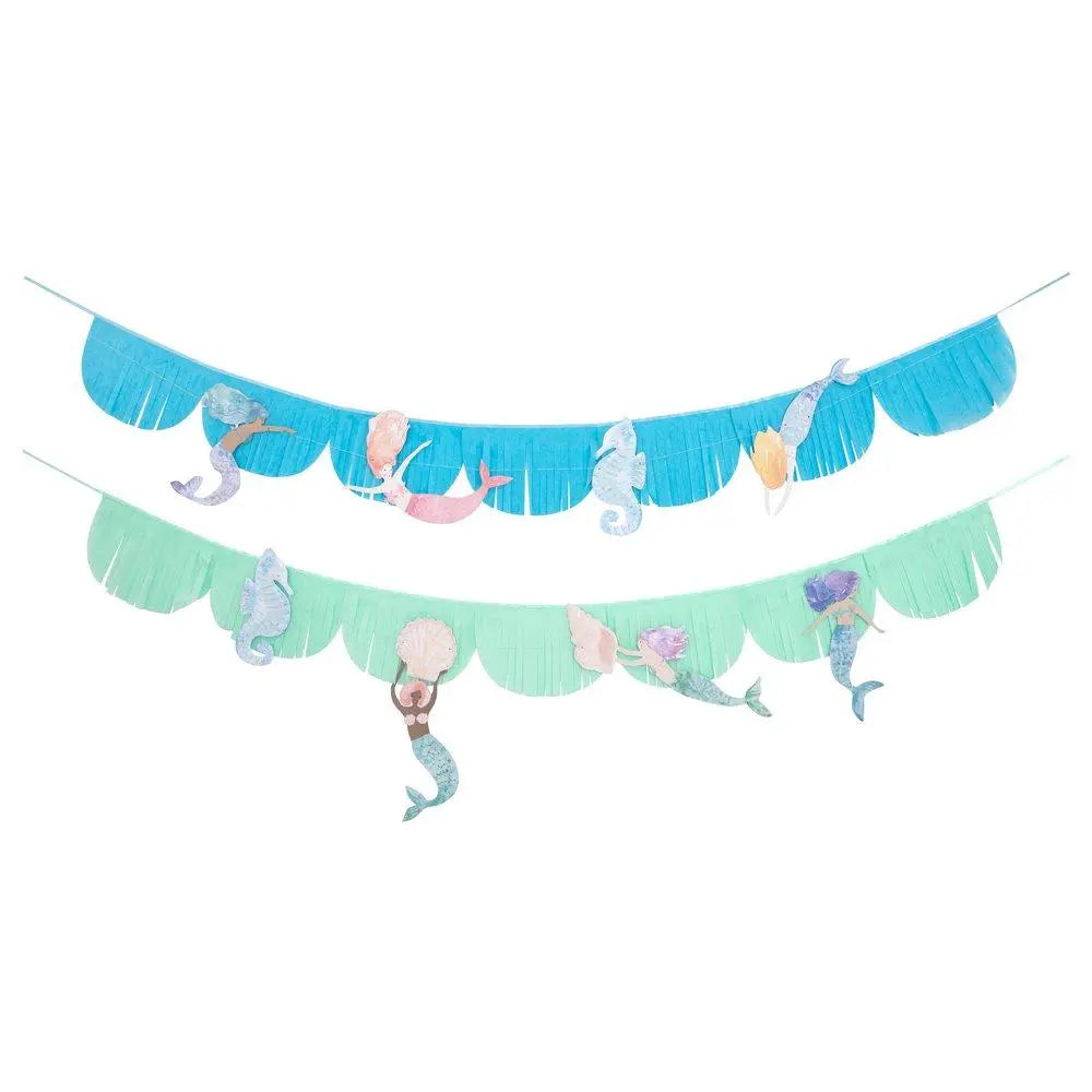 Donnez un look incroyable à une fête de sirène ou sous la mer avec ces magnifiques guirlandes en papier de soie à franges. Ils présentent de magnifiques sirènes et hippocampes, avec des détails scintillants en aluminium bleu et rose.
