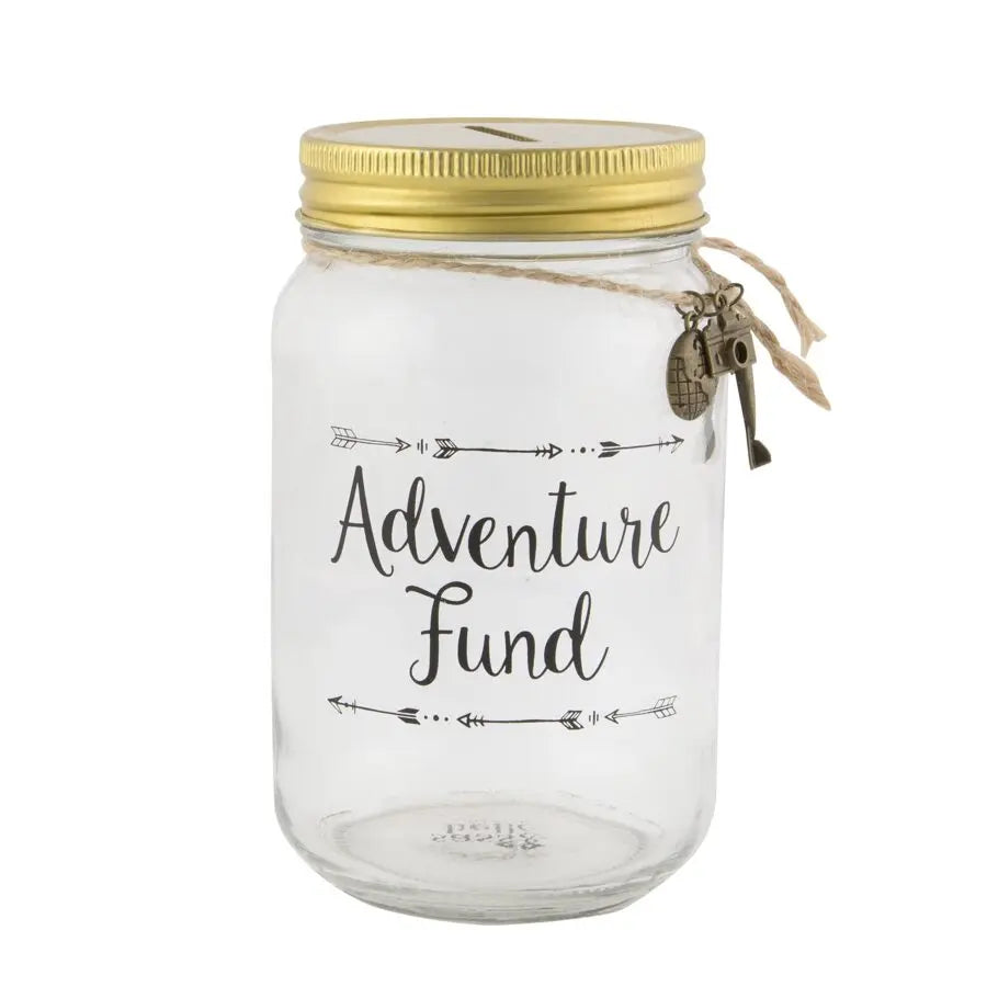 Save for your next adventure with our beautiful Adventure Fund Jar Money Box. From the Wanderlust Adventure collection, this jar repurposes the mason jar, transforming it into a chic saving tool. Made from clear glass, you can see how many pennies you save as you go! It features a screw-top lid and the quote 'adventure fund' is adorned. The jute string and travel inspired charms add a lovely finishing touch.