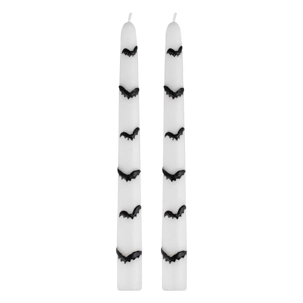 2 x Non scented tapered candles with x6 black 3D bats, measuring 24cm (H) x 2.2cm (W)