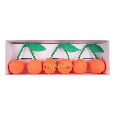 We've come up with a brilliant new take on the traditional "surprise ball" idea - surprise cherries! Designed to look just like the ones in the supermarket, each pack contains three pairs of cheery cherries, complete with stems and leaves! Each cherry comes wrapped in layers of colored crepe, containing lots of little treats including temporary tattoos, jokes, hats, and a friendship bracelet or joke mustache.