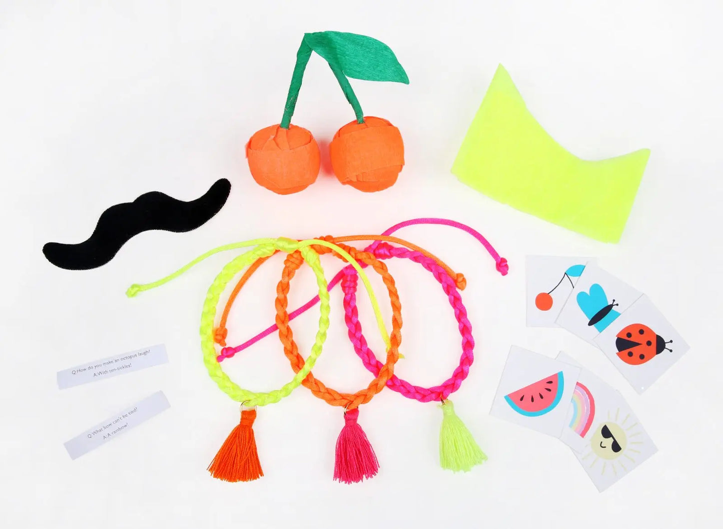 Each contains 2 temporary tattoos, 1 joke, 1 hat & either 1 friendship bracelet or 1 mustache
