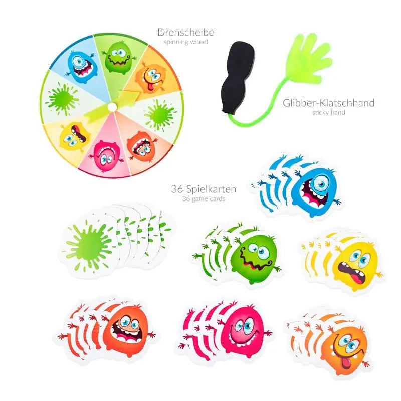 Play & action – super fun sticky hand catching game! Embark on a fun monster hunt and try to catch as many monsters as you can with your sticky hand! To start, all the monster cards are spread out on the table and the youngest player begins by spinning the game wheel. Now it's time to catch the right monster with the sticky hand and to keep collecting as many as possible in order to win. The playing instructions can be found on the back of the packaging.