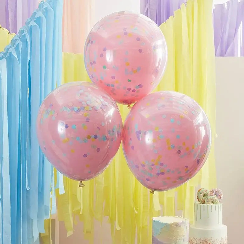 3 x 18" Double Layered Pink Balloons with Pastel Rainbow tissue confetti.