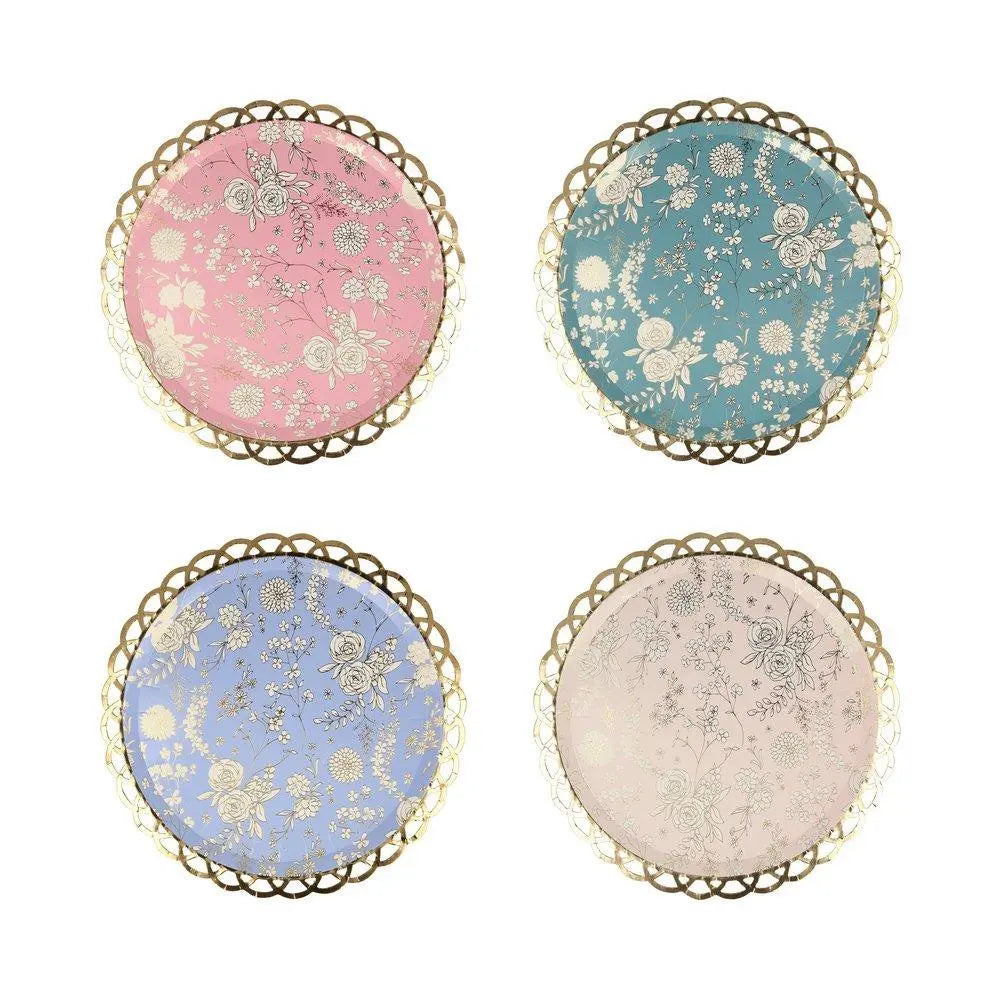 These elegant English Garden Lace side plates will add a beautiful touch to your table setting. Perfect for a tea party, anniversary, engagement or wedding. Available in a pack of eight, with four colours - pale pink, dark pink, blue and green. They have gorgeous gold foil detail with a foil outline pattern.