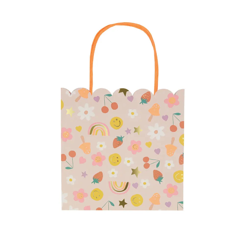 Put an even bigger smile on your guests' faces with these party bags covered in happy designs. Fabulous, fun icons with more than a whiff of 90s nostalgia – smiley faces, mushrooms, rainbows, fruit, stars, hearts and flower power!