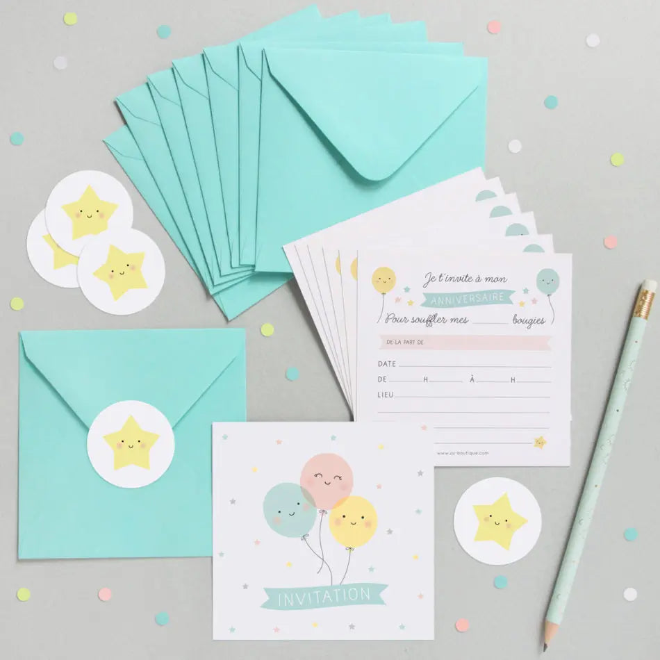 Voici un joli lot de 8 invitations à remplir sur le thème des ballons accompagnées de 8 stickers et 8 enveloppes mint.