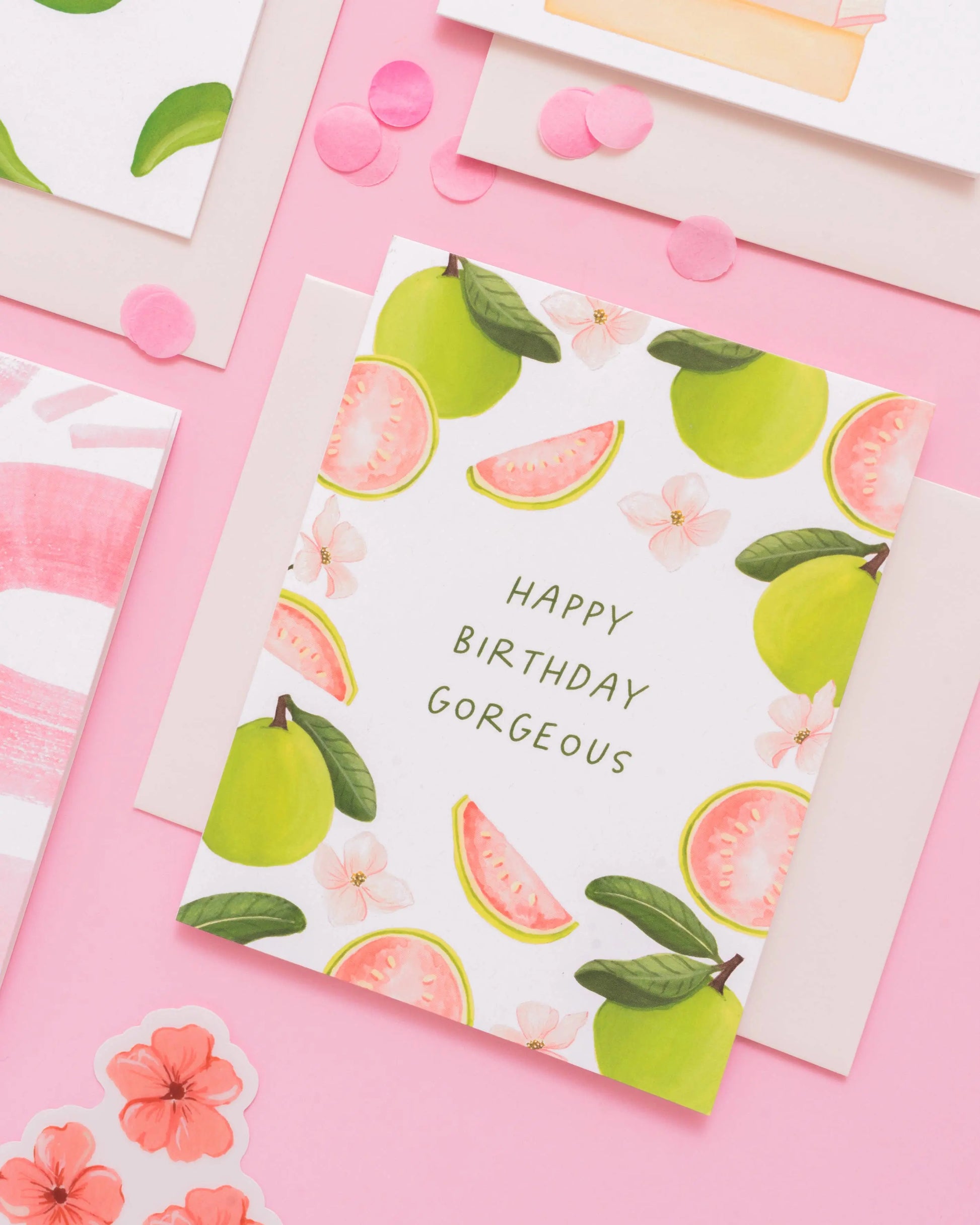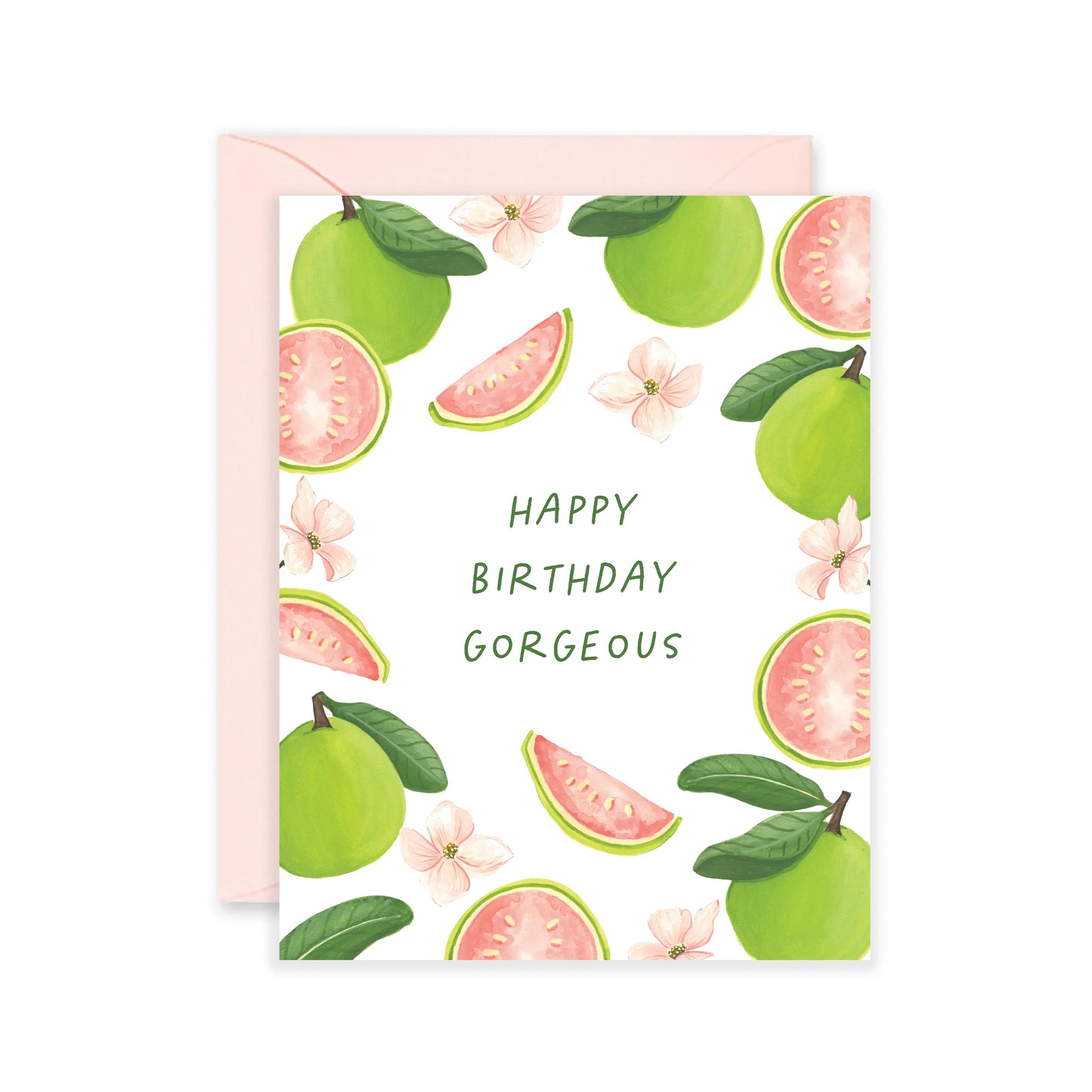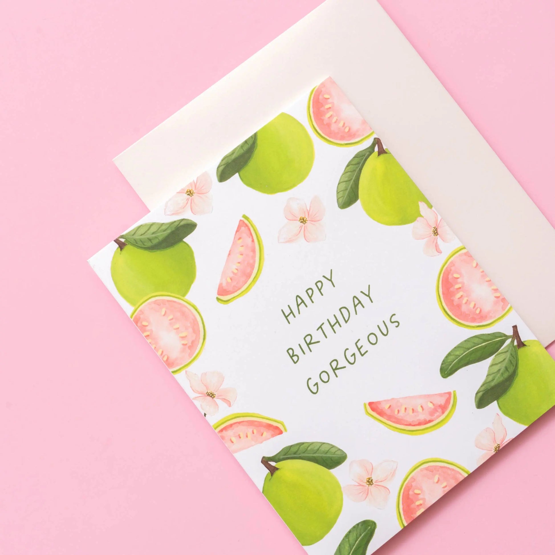 Brighten someone's birthday with this hand painted greeting card - featuring a colorful, vibrant guava design and reads "happy birthday gorgeous."