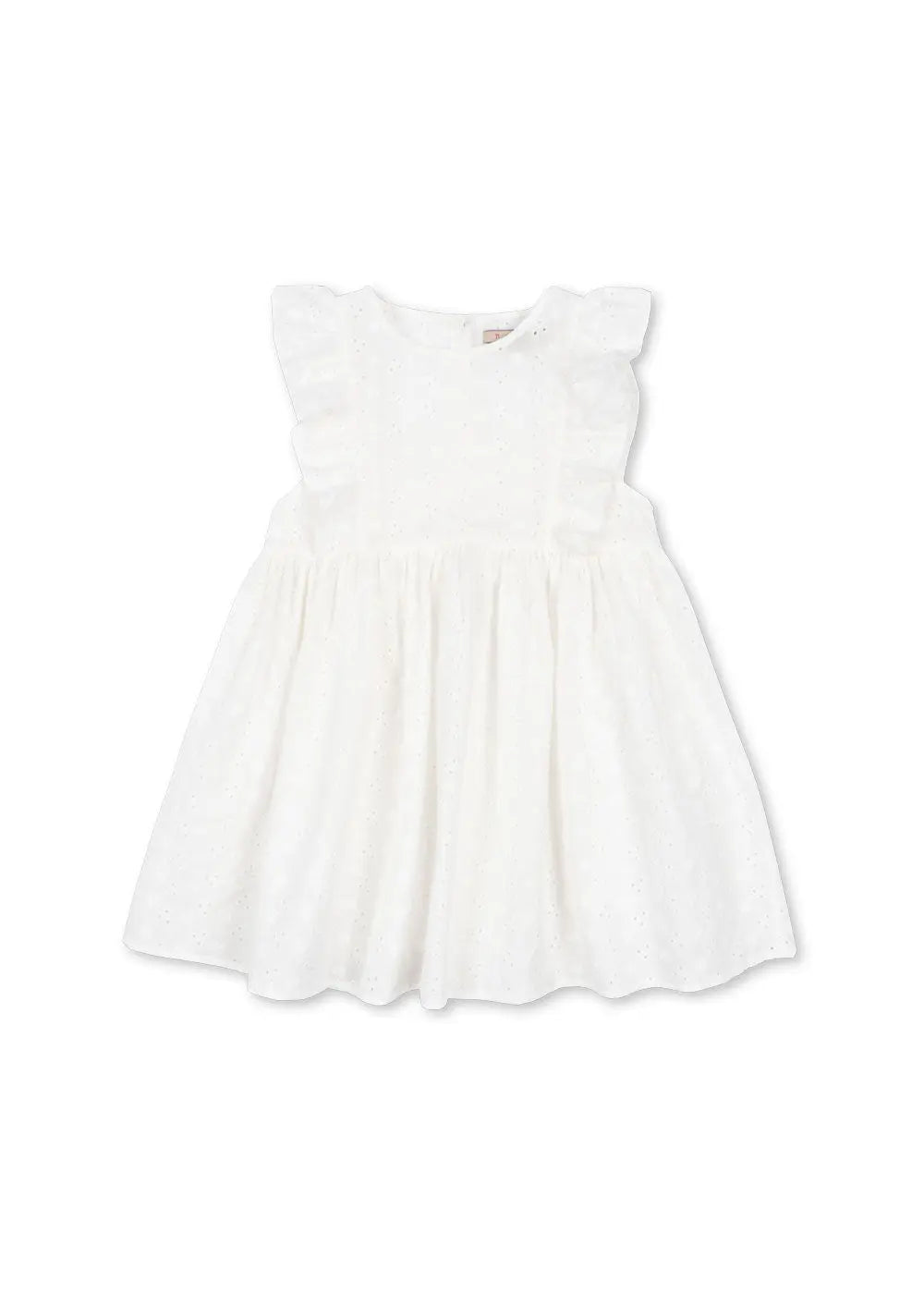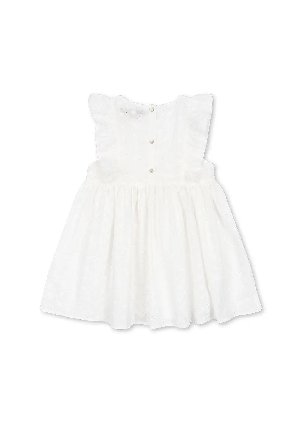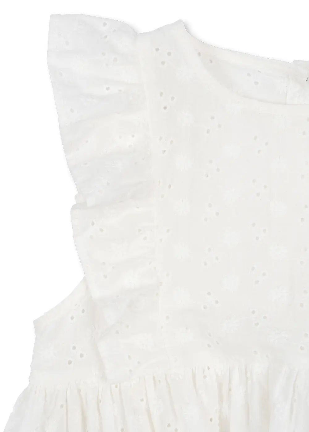 Sleeveless dress in broderie anglaise with frills along the shoulders. Material: 100% cotton.