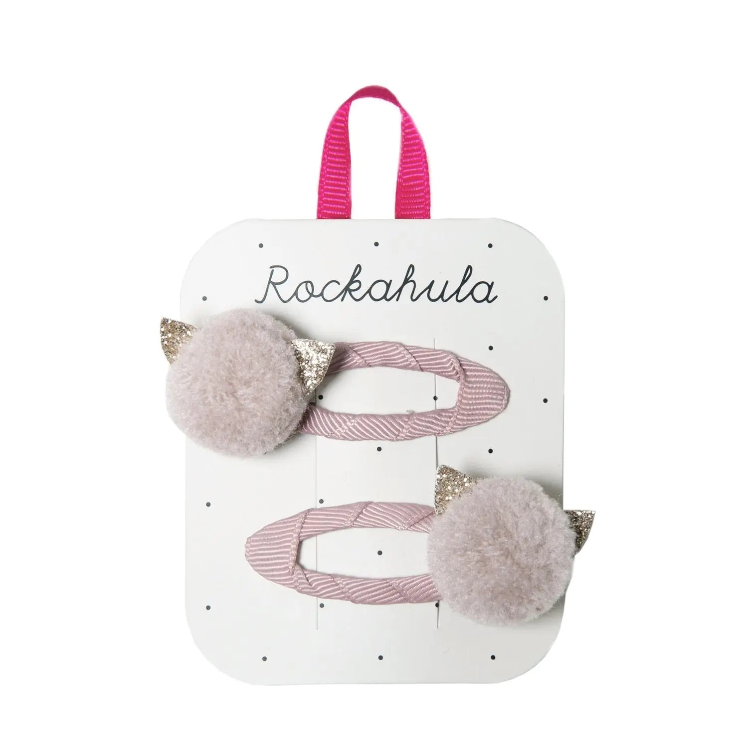 Two little pom pom cats, each with little glittery ears and secured onto a grosgrain ribbon wrapped snap clip. So sweet and wearable, perfect for everyday!