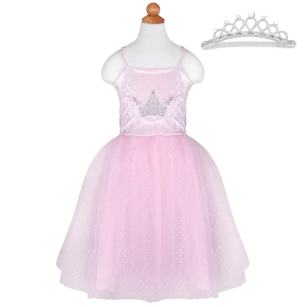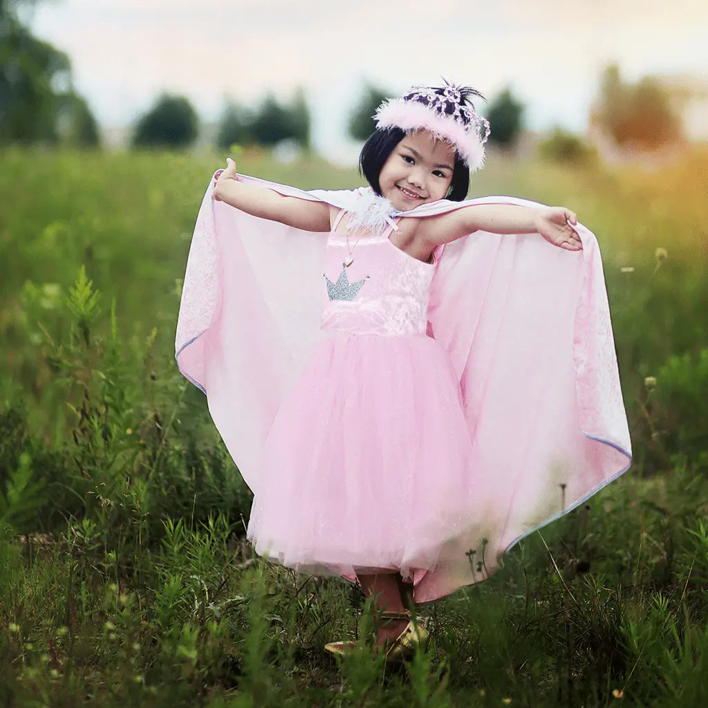 Made in Canada our Great Pretenders® classic Princess Dress is not only adorable but comes with a tiara! This two piece set feature a beautiful pink sparkle tulle dress, with a heat sealed princess crown emblem embellished with gems. The silver glitter elastic straps allow for size flexibility. Our Pretty Pink Princess dress includes a glitter tiara headband with pearl gem details. Is your little one set to make the world pretty, in pink
