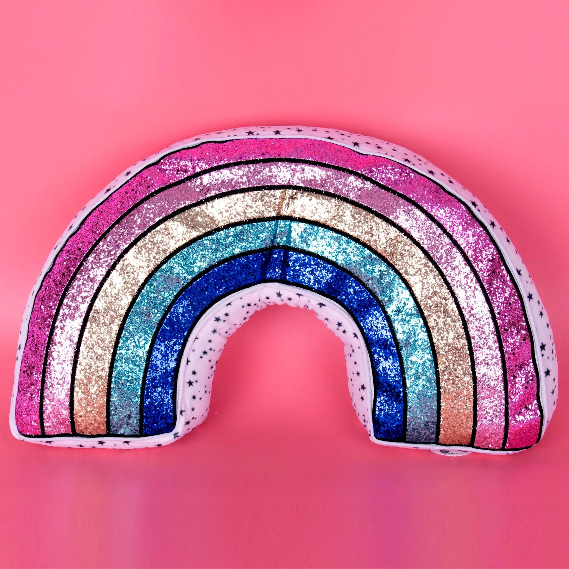 Multicolor rainbow cushion. On the front has bright multicilor glitter stripes and the back has a pattern with stars and a softer touch. Dry cleaning.
