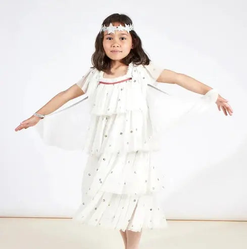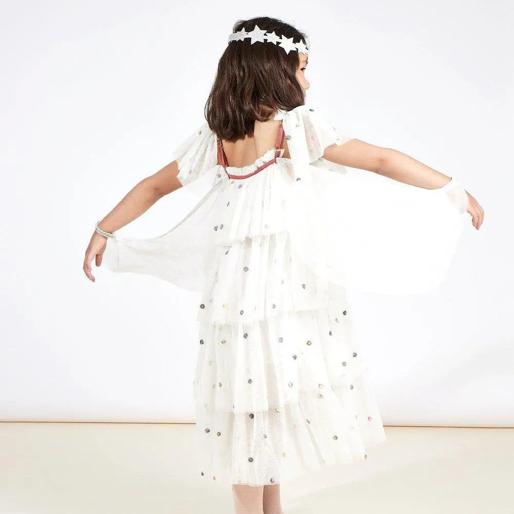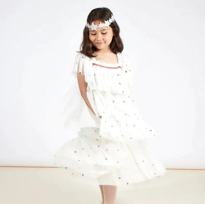 Transform your kids into beautiful angels with this delightful costume. It is perfect for plays, parties and dress up, for hours of imaginative fun. It features a gorgeous tulle sequinned dress, with removable wings, and a silver glitter star headband.